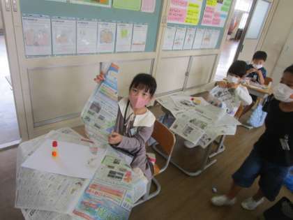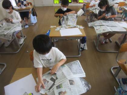 今日は包装紙や新聞紙を破いた形から、いろいろなものに見立てて作品を作りました。