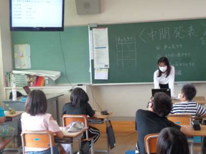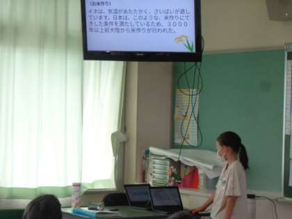 5年生は、「米」をテーマにそれぞれで課題を設定して調べ学習を進めています。今日は、中間発表を行いました。自分が調べたところまでをスライドでまとめて発表しました。