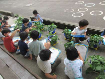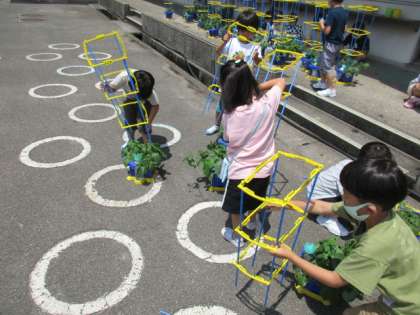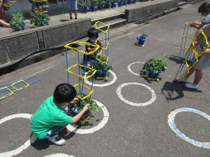 生活科では、あさがおの観察を行いました。以前観察したときより、葉の大きさやつるの長さが大きく成長していました。これからどんどんつるを伸ばしていくあさがおのために、支柱を立てました。「早く花が咲かないかな」と楽しみにしている子供たちでした。