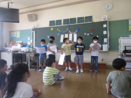 【1年生】お楽しみ会3 公開日 2022/06/17 更新日 2022/06/17 1年生 クイズ係のクイズもありました。全部で5問ありましたが、子供たちは正解したい気持ちでたくさん手を挙げていました。