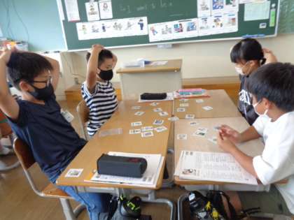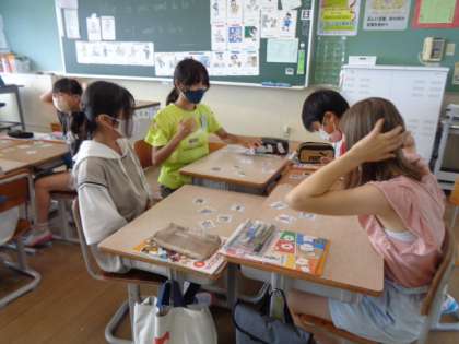 外国語の学習で、なりたい職業の伝え方を学習しました。授業の最後には、久しぶりにカルタゲームをして発音などを確認をしました。