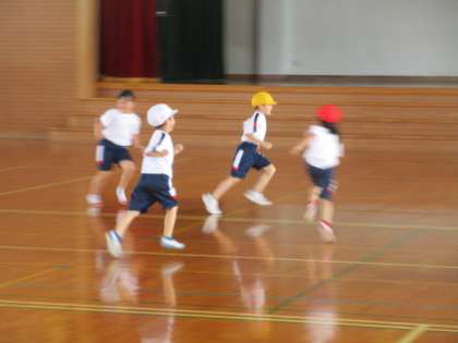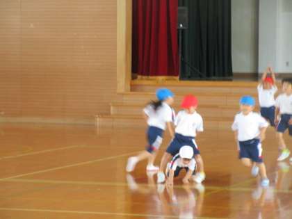 体育では、鬼遊びをしました。今日は、捕まった友達を助けるために、友達の足下をくぐるというルールで鬼ごっこをしました。