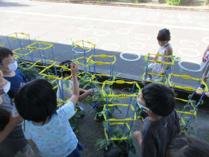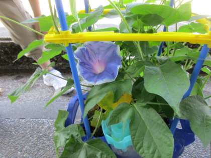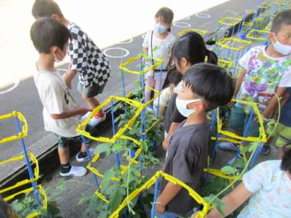 朝、あさがおの水やりをしていた子供たちから「あさがおが咲いてるよ!」と大きな声が上がりました。見ると、青紫色の花が1つ開いていました。うれしそうに花を見ている子供たち。「次は誰のが咲くかな」「何色の花が咲くかな」と友達と楽しそうに話していました。