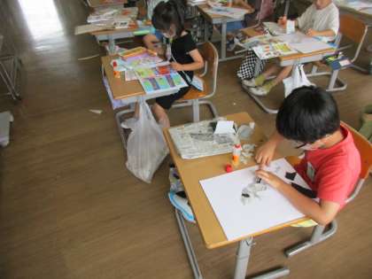 【1年生】やぶいたかたちから 公開日 2022/06/23 更新日 2022/06/23 1年生 図画工作では、先週に続いて、破った紙を使って作品を作りました。新聞紙や色紙を細かく破って組み合わせたり、破った紙を見て「○○みたい」と想像を膨らませたりしながら作品を作りました。