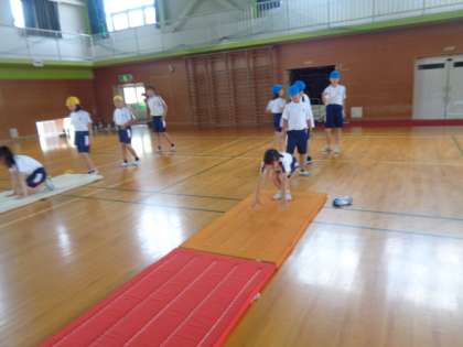 【5年生】マット運動 公開日 2022/06/24 更新日 2022/06/24 5年生 マット運動で、カエルの足うちをしています。体を逆さまにする動きにも子どもたちは慣れてきています。そこで今日は、3点倒立を練習しました。補助の練習もし、ペアやグループに分かれて何度も挑戦する姿が見られました。