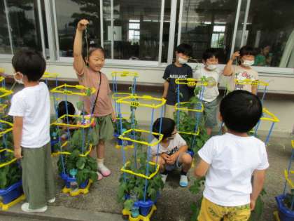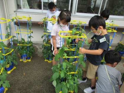 あさがおの蔓がぐんぐん伸び、支柱の高さを超えているものや、横に広がって友達の支柱に巻き付いているものもありました。今日は、鉢の間隔を広げたり、週末に向けて水をたっぷりあげたりしました。「ぼくより大きいよ」とあさがおと背比べをしながら生長を喜んでいる姿も見られました。