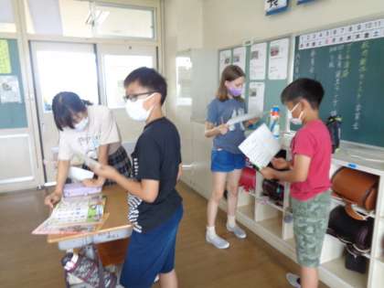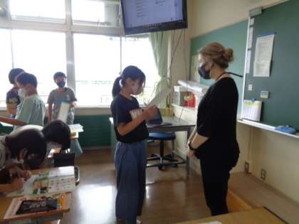 ALTの先生と一緒に外国語学習に取り組んでいます。ペア学習では、進んでALTの先生のところに行って積極的にコミュニケーションを取ろうとする姿が見られました。また、男女関係なく声を掛け合って学習に取り組んでいます。
