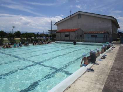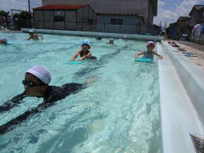 体育では、プールが始まりました。水に顔をつけたり、歩いてみたりと、水に慣れる活動を行いました。