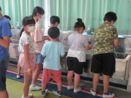 「洗い残しは、どんな洗い方できれいになる?」と尋ねると、適切な手洗いを教えてくれる子供たち。これまでの経験や掲示物を通して、適切な洗い方を知っているようです。