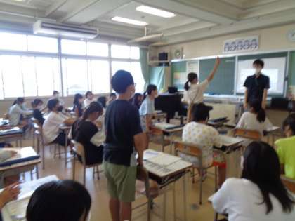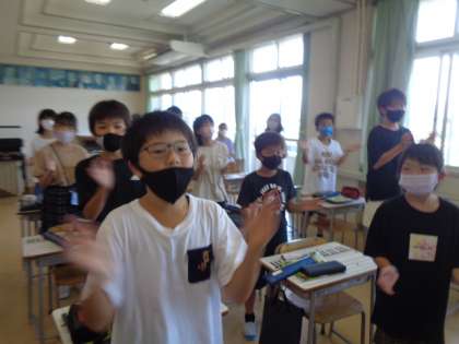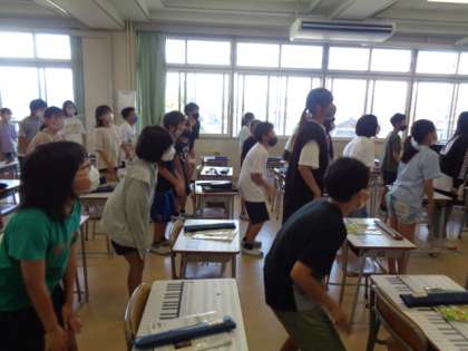 リズムうちの後、学年でパートに分かれて『いつでもあの海は』を練習しました。ソプラノ、アルトでパートが分かれるところを重点的に練習し、最後に、歌っている様子を録画し確認しました。自分たちの成長を感じられたのではないでしょうか?