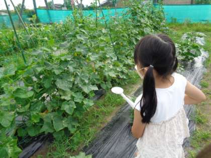 暑い日が続きますが、野菜たちはますます元気に成長しています。朝の支度を終えると、毎日交替しながら水やりをしています。成長が気になったり、肥料をあげたりしたい子も朝のお世話に参加しています。