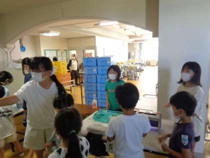 保健委員会による手洗い実験会が行われました。今日は、青団の人たちが参加をしました。保健委員会の5年生が自分の仕事に最後まで責任を持って取り組む姿や、団の下級生に声をかける姿が見られました。