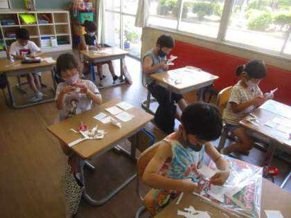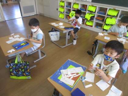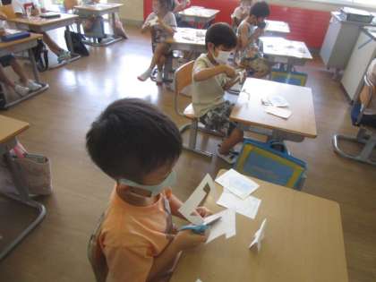 はさみの使い方も、最初は「切りにくいなあ」と言っていた子供たちでしたが、おもしろい形が作れると、楽しんでどんどん切っていました。
