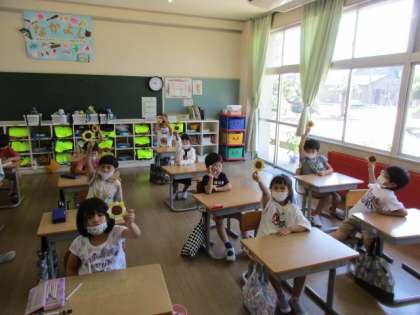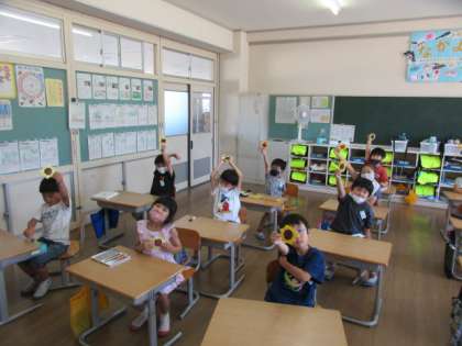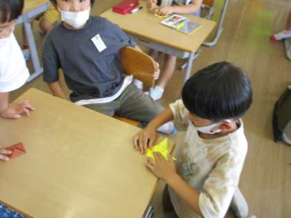 お楽しみ会の後半は,折り紙をしました。ヒマワリを折りました。折り方を知っている子や完成した子は、近くの友達に教えてあげました。完成して、満足そうな子供たちでした。