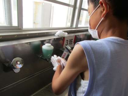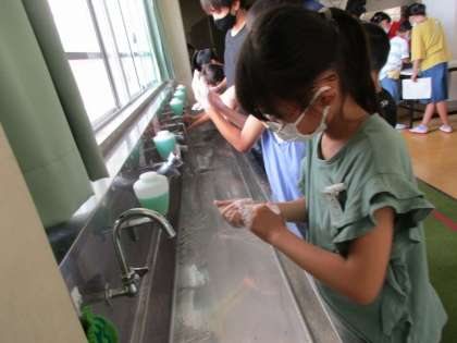 今日は黄団の手洗い実験会をしました。栄養教諭の先生も一緒に、洗い残しやすい場所と洗い方をチェックしました。やはり、爪の先・指と指の間・手の平のしわに洗い残しがあるようです。