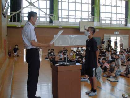 県陸上交流大会でのがんばりを、全校が集まる場で表彰していただきました。