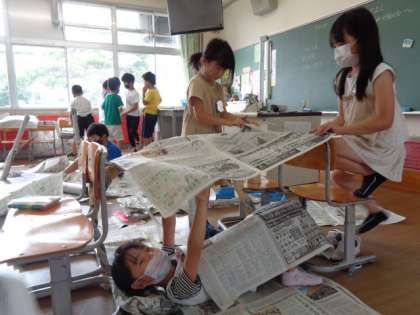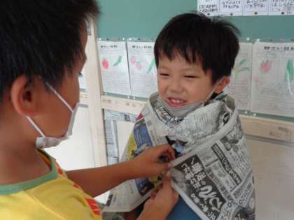 新聞紙で変身したり、新聞紙のベッドで寝たり。とっても楽しそうです。