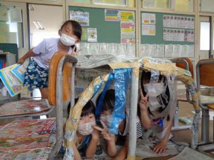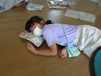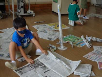 【2年生】図工「新聞紙と仲良し」その3 公開日 2022/07/14 更新日 2022/07/14 2年生 中に新聞紙を丸めて入れて枕を作ったり、筒のように丸めて柱にしたり。新聞紙1枚の「柔らかさ」と、まとめて使う「固さ」をうまく使って工作を楽しんでいました。