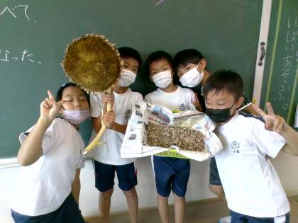 3年生 理科「実ができたよ」 公開日 2022/08/31 更新日 2022/08/31 3年生 ひまわりの種を収穫しました。 収穫した種はしばらく干し、家に持って帰ったり、次の3年生に渡したりする予定です。また来年、きれいな花が咲くといいですね。