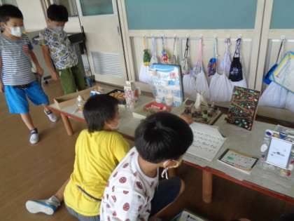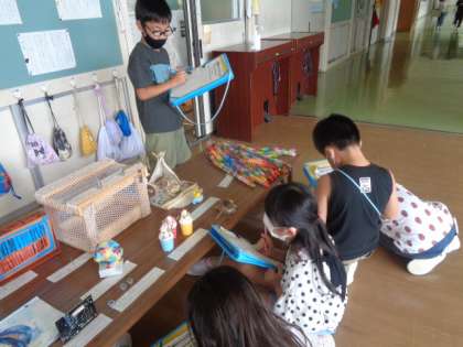 校内夏休み作品展を見て回りました。子供たちは、「すごい」「どうやって作ったんだろう」「おもしろそう」「やってみたい」と他学年のの素晴らしい作品を楽しんで鑑賞していました。作品展は9日(金)までです。