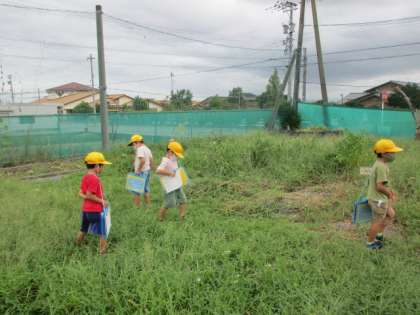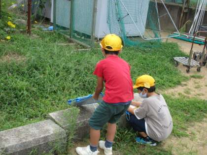 なかよしタイムや昼休みに虫採りしている子供も多く、「こっちでカマキリを見たよ」と言いながら、観察池の近くや、畑の周りなど、草がたくさん生えている場所を探しました。