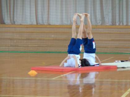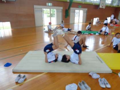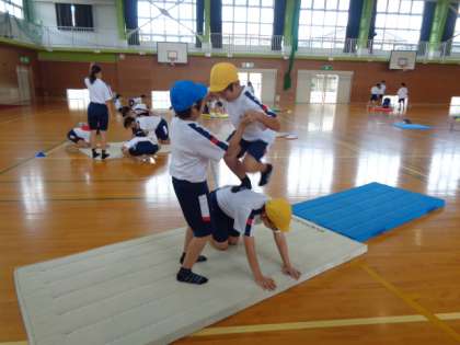 学年体育では、一人技を発展させた応用技に挑戦しています。複数の人数で行うため相手と息を合わせること、友達とサポートし合うことが大切になってきます。安全に気をつけて練習に取り組んでいます。