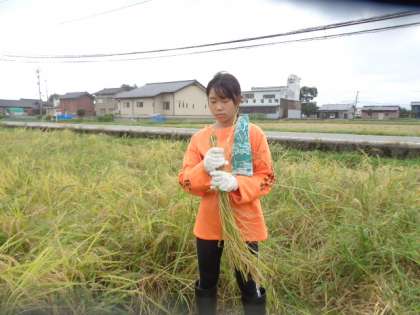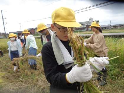 子どもたちは手作業で稲を刈ることの大変さを経験しました。一部老人クラブの方に機械を使って刈っていただきました。感想の中には、「社会で農業の機械化を学習したけど改めて機械が出てきたことで農家の方の苦労が減ったことを理解できた。」とありました。身をもって体験できたようです。