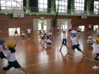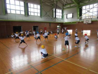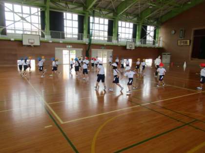 体育では、いろいろな動きを楽しんで運動をしました。体育館の線の上をスキップやジャンプをしながら通ったり、先生やペアの友達と体を使ってじゃんけんをしたりしました。