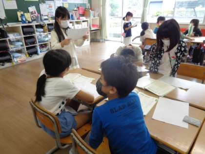 【2年生】国語 公開日 2022/09/28 更新日 2022/09/28 2年生 「どうぶつ園のじゅうい」の学習のまとめとして書いた作文をみんなで聞き合いました。獣医の仕事はとても興味深く、楽しく読み深められました。