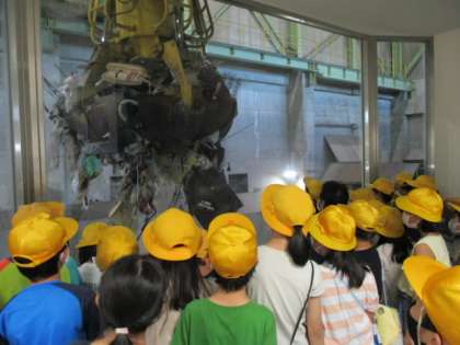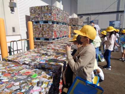 リサイクルセンターでは、リサイクルされた商品が売られているところや、缶がプレスされた物を見たり、燃やせないごみを処理しているところを見学したりしました。そして、火種になるものは捨てないことや、飲み終わったあとの空き缶は水で洗ってから捨てること等、規則を守ってごみを捨てることの大切さを実感していました。