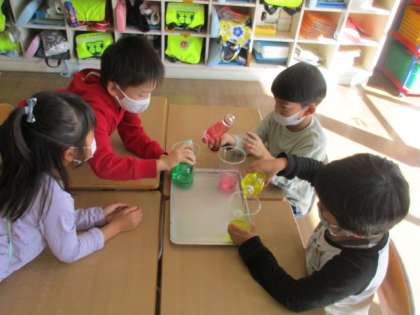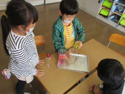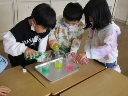 3つの容器に入っている水の量を比べました。コップに移し替えて比べるために、グループごとに協力して学習を進めました。
