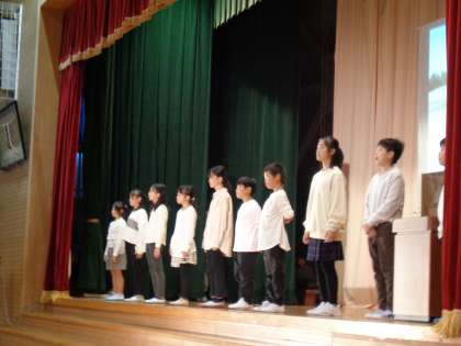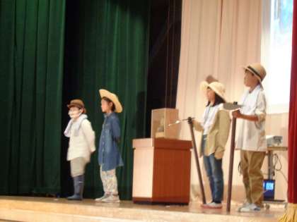 【4年生】学習発表会本番2 公開日 2022/10/16 更新日 2022/10/16 4年生 声の大きさ、間を空けること、身振り手振りを入れて演技をすることに意識していました。感動の劇になりましたね。