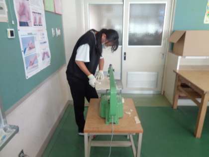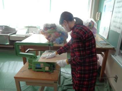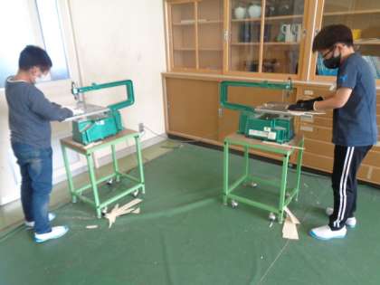 糸のこを使って木を切り出しました。前回段ボールで練習したときと比べて、切りにくく大変だったと口々に言っていましたが一生懸命取り組んでいました。