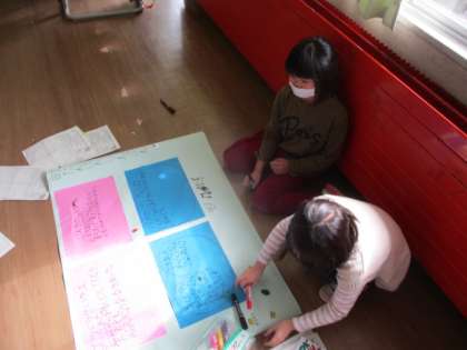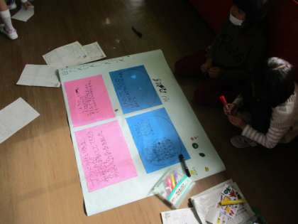 新聞に写真をはったり絵を描いたりしている子供たち。見ている人が興味を持つように工夫する姿が見られました。