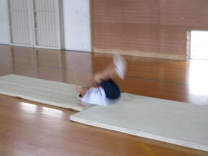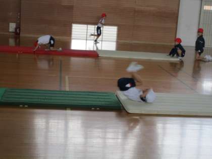 前転にも挑戦しました。両手をしっかりついて、前に転がります。何度も練習するうちに、少しずつまっすぐ転がれるようになってきました。