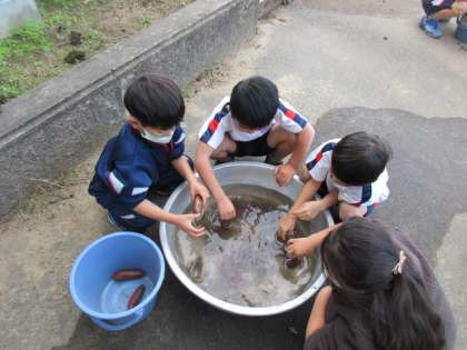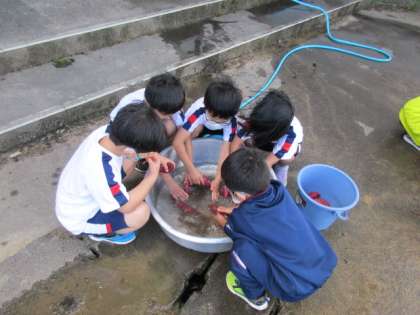 1年生は、明日の焼き芋大会に向けて、さつまいもを洗いました。水が冷たくなってきましが、一生懸命土を落としました。子供たちは、洗いながら、だんだん鮮やかな紫色になっていく様子を見て、うれしそうにしていました。
