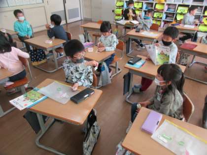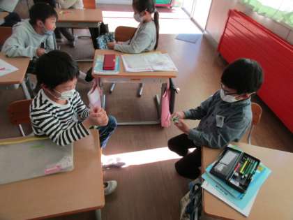 算数では、繰り上がりのあるたし算の学習をしています。今日は、たし算カードを使い、友達に問題を出し合いながら計算の練習をしました。たくさんの問題に答えようと頑張っている子供たちの様子が見られました。