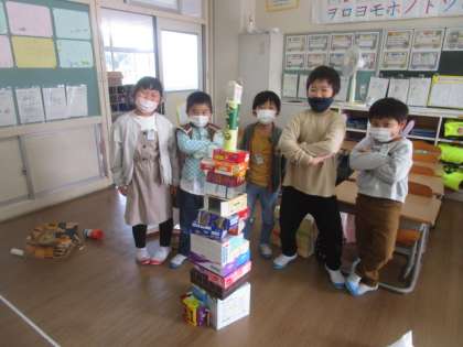 たくさん積み上げたり、倒れたりしながら、何度も挑戦していました。子供たちからも「こうしたらどう?」「倒れちゃったー!」など声がたくさん聞こえました。