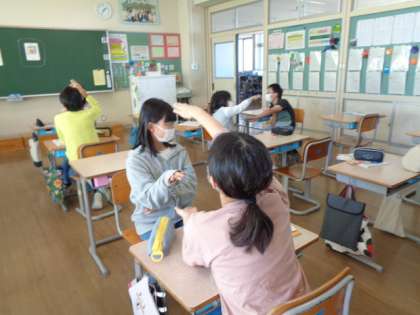 外国語の学習では、道案内や場所を示す言葉を学習しています。ペアの人と一緒にゲームをしながら楽しんで学びました。
