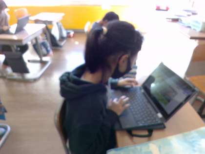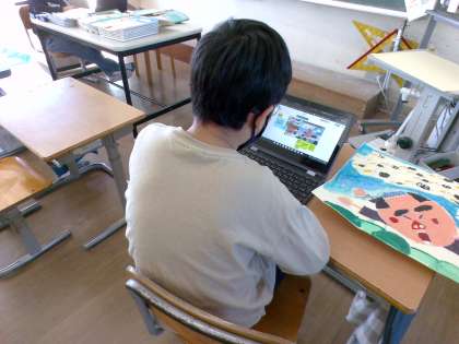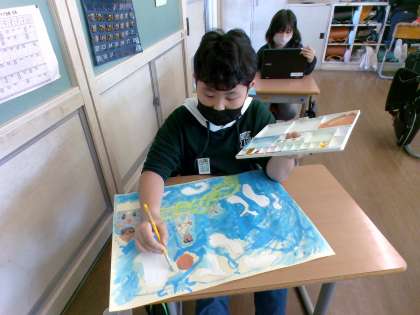 図工の時間では、物語から感じたことを絵に表しています。完成した子どもたちは、クロムブックを使って自分の頑張ったこと、友達の作品のよいところを書いています。進んで友達のよいところを書く姿、書いてくれた友達に「ありがとう」という姿。担任も心が温かくなりました。