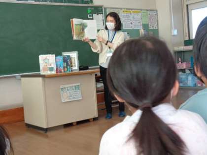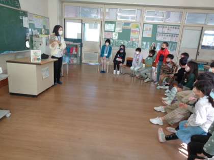 【2年生】図書館訪問 公開日 2022/11/10 更新日 2022/11/10 2年生 婦中図書館から司書の先生が来てくださいました。6月に電車で婦中図書館に行ったときにお世話になった先生に会えて、子供たちは喜んでいました。今日は素話「7羽のカラス」と秋冬にまつわる本を6冊紹介してくださいました。