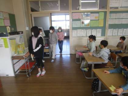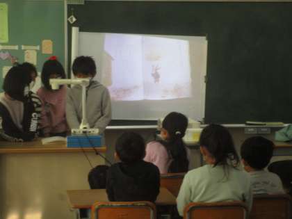 3年生さんに読み聞かせをしてもらいました。1年生にとって、児童から読み聞かせしてもらうことは初めてでした。読む場所を分けたり、役になりきって読んだり、3年生さんの工夫が見られ、子供たちも聞き入っていました。