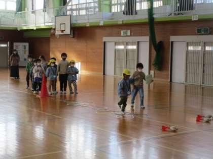 体育館では、ケンパやロケット投げ、平均台の運動をしました。やり方の手本を見せたり、隣で教えてあげたりしました。