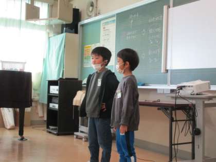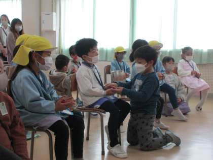【1年生】小学校へようこそ本番 その5 公開日 2022/11/15 更新日 2022/11/15 1年生 音楽室では、1年生の歌に合わせて、年長さんがカスタネットを鳴らしました。「こうやって持つんだよ」「上手にできたね」と優しく声をかけていました。