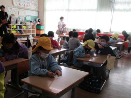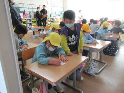 教室では、鉛筆を持って、自分の名前を書く勉強を体験しました。鉛筆の持ち方を優しく教えてあげました。