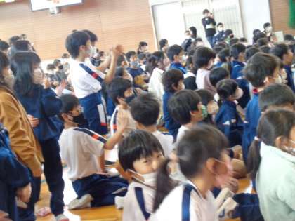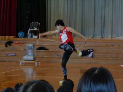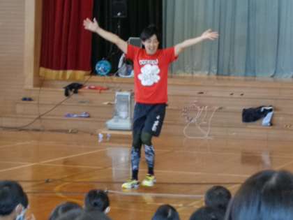 ギネス記録12個、なわとび世界選手権1位種目5個の記録をもつ生山ヒジキさんが縄跳びパフォーマンスを見せてくださいました。3重跳びや4重跳び、決めポーズといった素晴らしい技を子供たちはキラキラの瞳で見つめていました。本物に触れる素晴らしい時間でした。