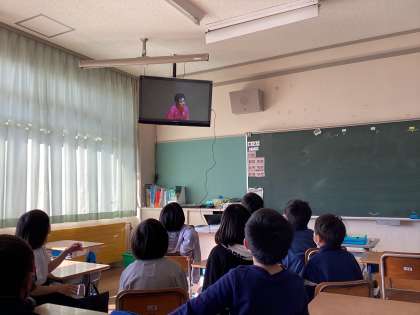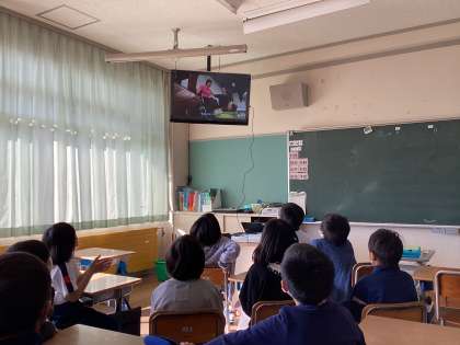 パフォーマンスを見終わった後、生山ひじき先生が挑戦した「24時間でなわとびを何回跳べるか」というギネスの記録にもなった動画を見ました。子供たちは真剣に見ていました。