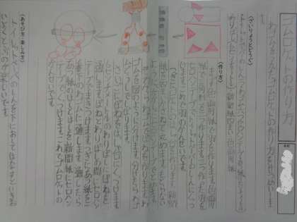 生活科で作っている「動くおもちゃの作り方」の説明文が完成しました。今日は説明文を読み合い、友達の文章のよいところを見つけ合いました。「まず」「次に」のような順序を表す言葉や、具体的な数や長さ、図を入れながら、初めて作る人にも伝わるように分かりやすい文章を書くことができました。