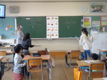 【5年生】外国語の学習 公開日 2022/12/05 更新日 2022/12/05 5年生 外国語の学習では、英語での注文の仕方を学習しています。今日は食べ物を英語で発音し、リスニングも兼ねたゲームをチーム対抗で行いました。