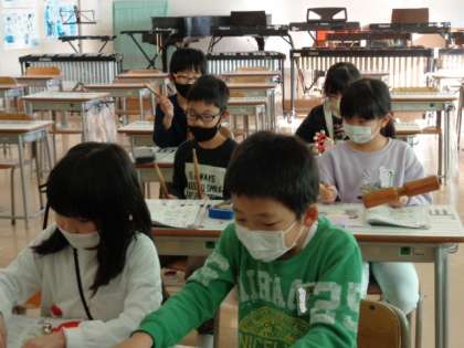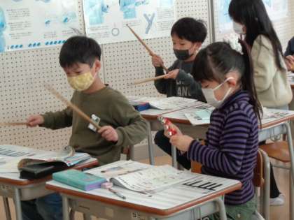 【2年生】音楽 公開日 2022/12/08 更新日 2022/12/08 2年生 「楽器でお話」の学習をしています。自分の選んだ打楽器とリズムで、ペアでお話をするようにリズム演奏をします。繰り返すうちに上手になってきました。